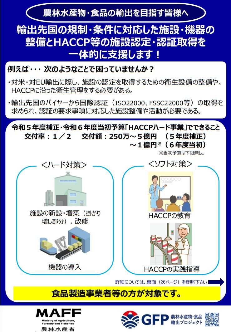 HP:食品産業の輸出向けHACCP等対応施設整備事業:農林水産省 (maff.go.jp)